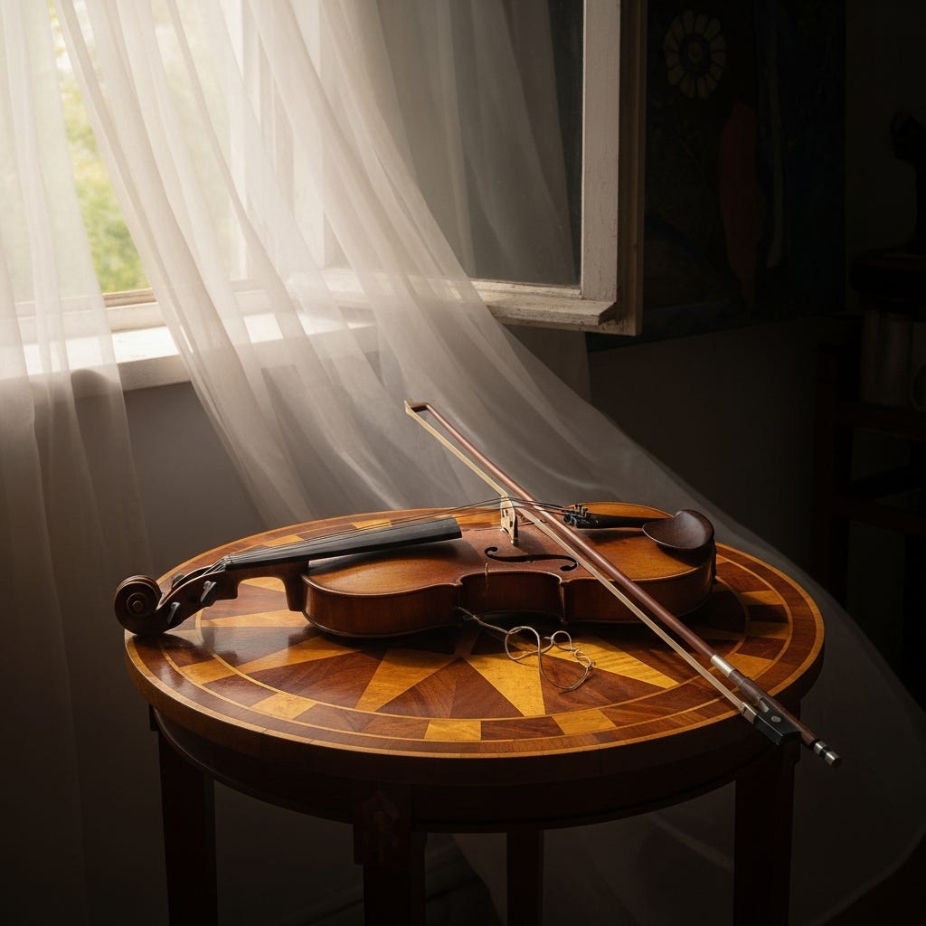 The bow rests, dusted with rosin. The violin lies beside it, mute but awake.